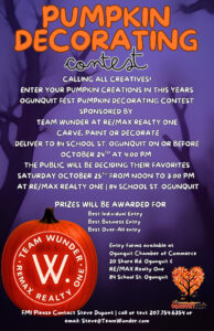 Carve, paint, or decorate your pumpkin and deliver it to 84 School St. on or before October 24th at 4pm. Entry forms are available at the Ogunquit Chamber of Commerce Welcome Center and the RE/MAX Realty One Office