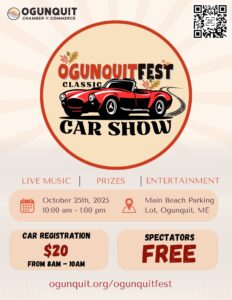 Come join us alongside the ocean in the Main Beach parking lot for the 17th annual Ogunquit Classic Car Show on Saturday, October 25, 2025!