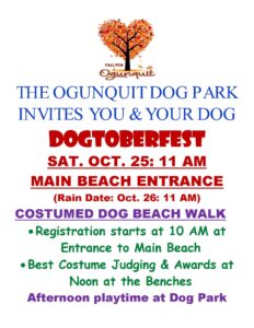 Costumed dogs will be registered and photographed at the start of the dog walk. Photos will be posted on the Ogunquit Dog Park Facebook Page. Judging is at noon! (Rain date, October 26.)
